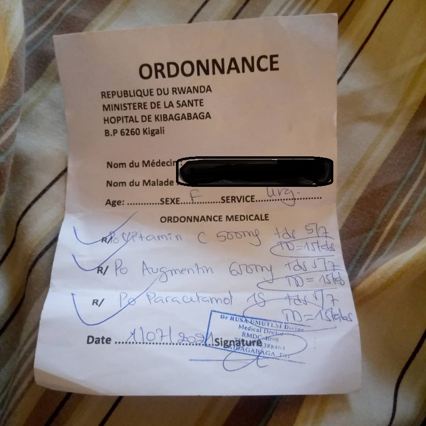 Ni urwandiko rwa Muganga wamuhaye umwe muri bo imiti. Umuganga yatubwiye ko iyi ari imiti y’ibanze ihabwa abanduye COVID-19.