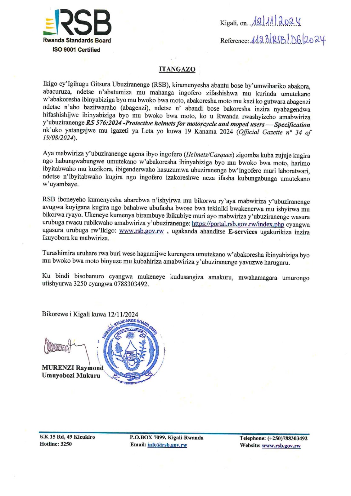 Hari itangazo ryasohowe n’Ikigo cy’igihugu cy’ubuziranenge, RSB( Rwanda Standards Board) rigena ibwiriza ry’ubwo buziranenge ryiswe ‘RS 576:2024-Protective Helmets for Motorcycle and Moped Users Specification’.