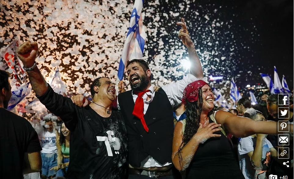Minisitiri w’Intebe Naftali Bennett akirangiza kurahirana n’abagize Guverinoma ye, abaturage bamushyigikiye bari ku mbuga yitiriwe Yitzhak Rabin (Rabin Square) baririmba, babyina banasangira ikirahuri.