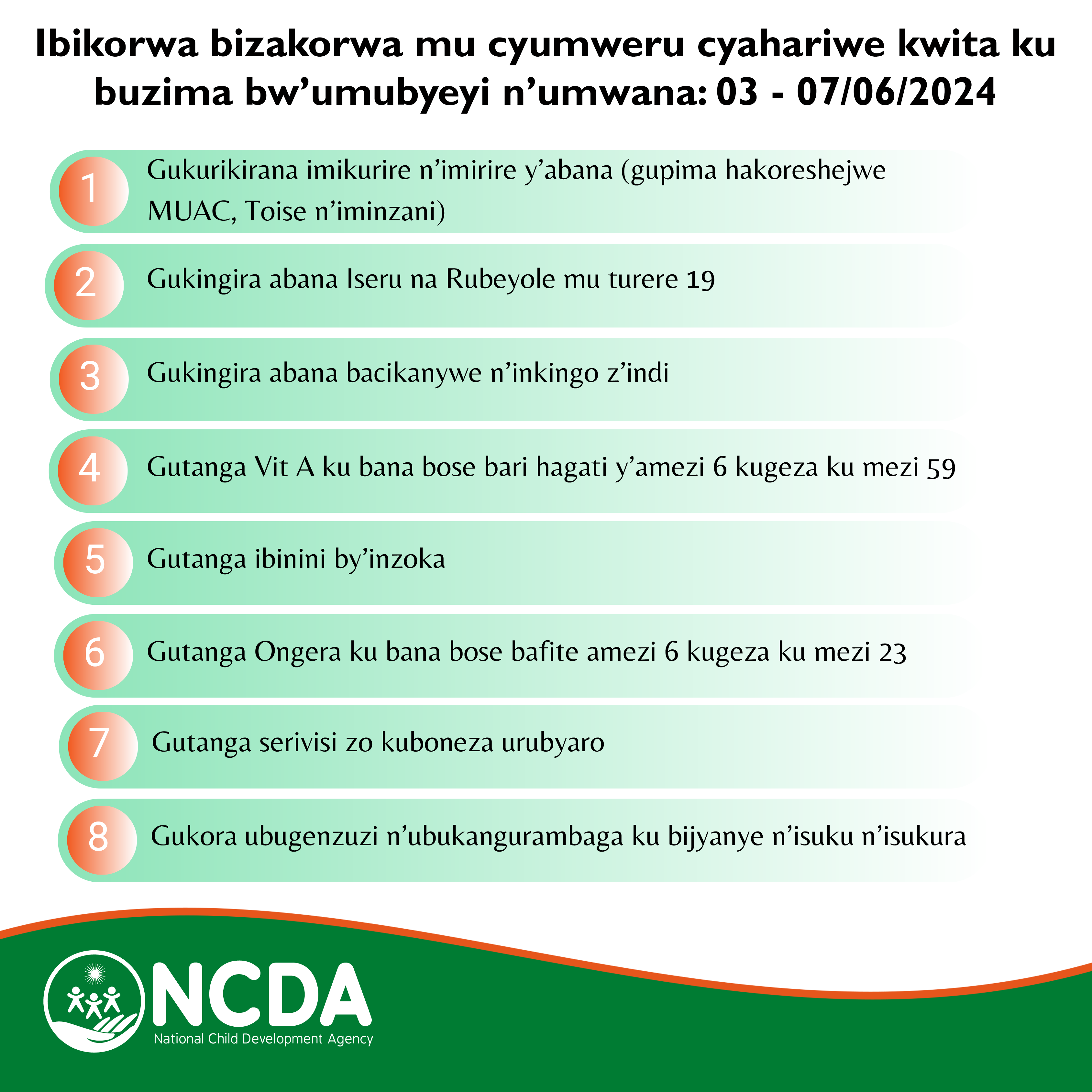 Muri cyo hateganyijwe gutangwa serivisi z’ubuzima ku bana n’ababyeyi babo cyane cyane ba Nyina zirimo guha abana inkingo n’ibinini by’inzoka kandi bagapimwa uko imikurire yabo ihagaze.