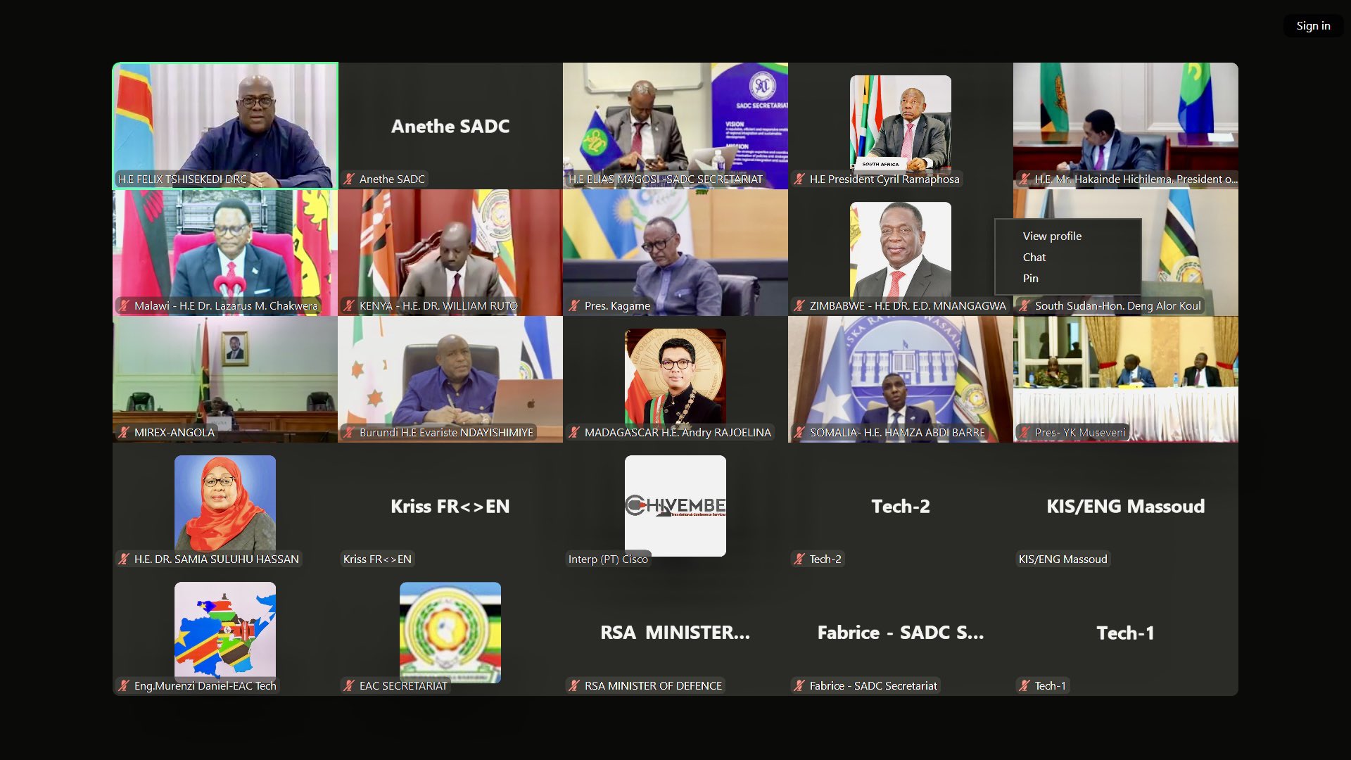 Hagati aho inama yataye iteranye mu buryo bw’ikoranabuhanga yahuje Abakuru b’ibihugu bya EAC na SADC yemeje ko Olesegun Obasanjo, Catherine Samba Panza wahoze uyobora Centrafrique, Kgalema Motianthe wahoze uyobora Afurika y’Epfo, Uhuru Kenyatta wayoboye Kenya Sahle-Work Zewde wayoboye Ethiopia batangwaho abahuza muri kiriya kibazo.