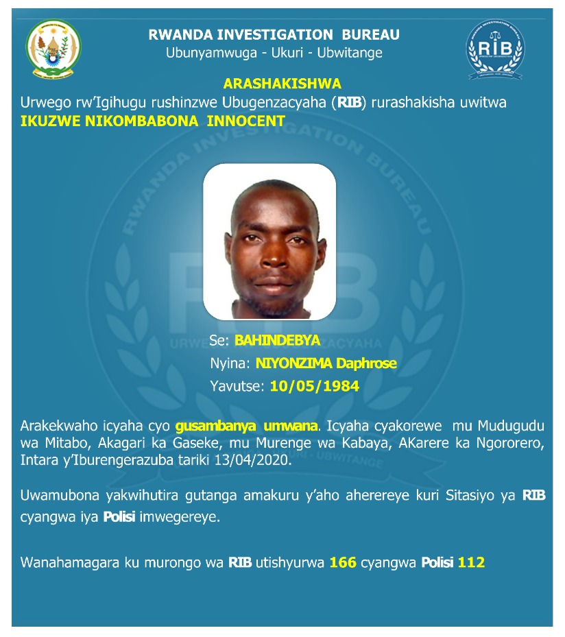 Urwego rw’igihugu rw’Ubugenzacyaha, RIB, bwasohoye itangazo risaba Abanyarwanda bose ko uwabona umugabo witwa Ikuzwe Nikombabona Innocent yatungira agatoki inzego z’umutekano agafatwa kuko rukumurikiranyeho icyaha cyo gusambanya umwana.
