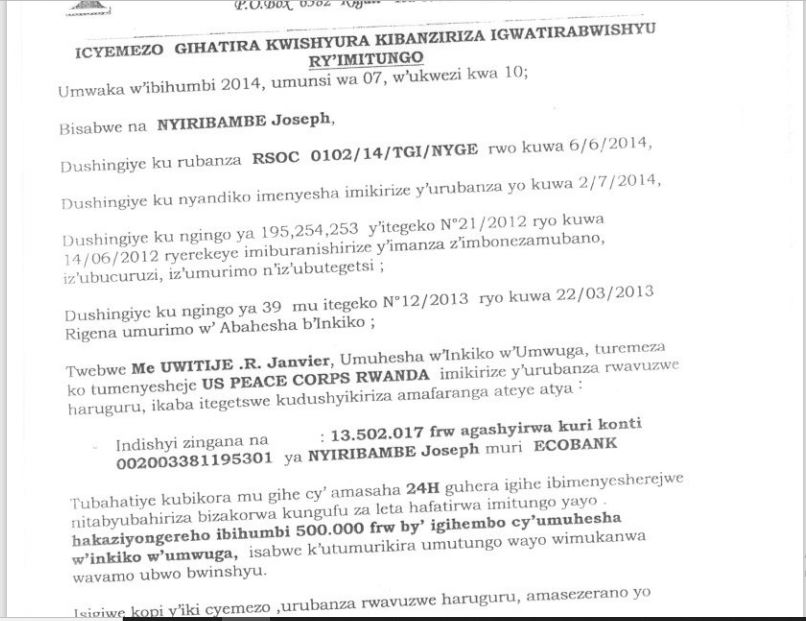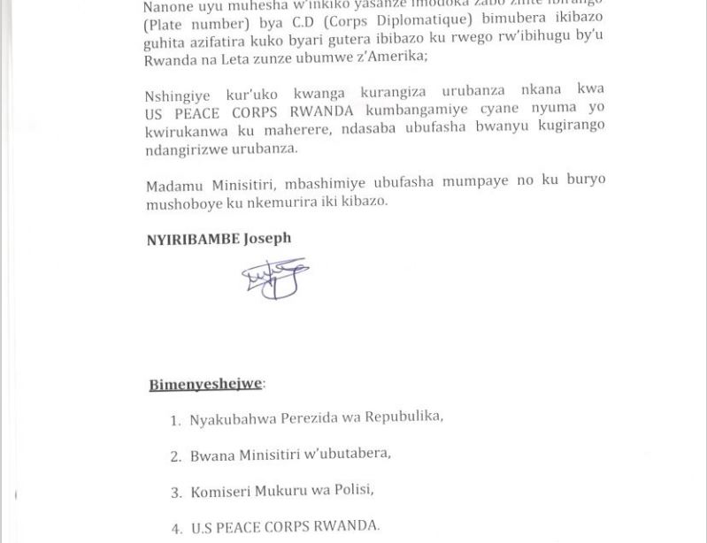 Muri iriya baruwa dufitiye kopi handitsemo ko umuhesha w’inkiko yasanze nta bushake bwo kurangiza urubanza US PEACE CORPS ifite, atangira gushaka uko yazagwatiriza imwe mu mitungo yayo ariko asanga imodoka zayo zifite ibirango bya CD (Corps diplomatique) kandi ntizigwatirizwa.