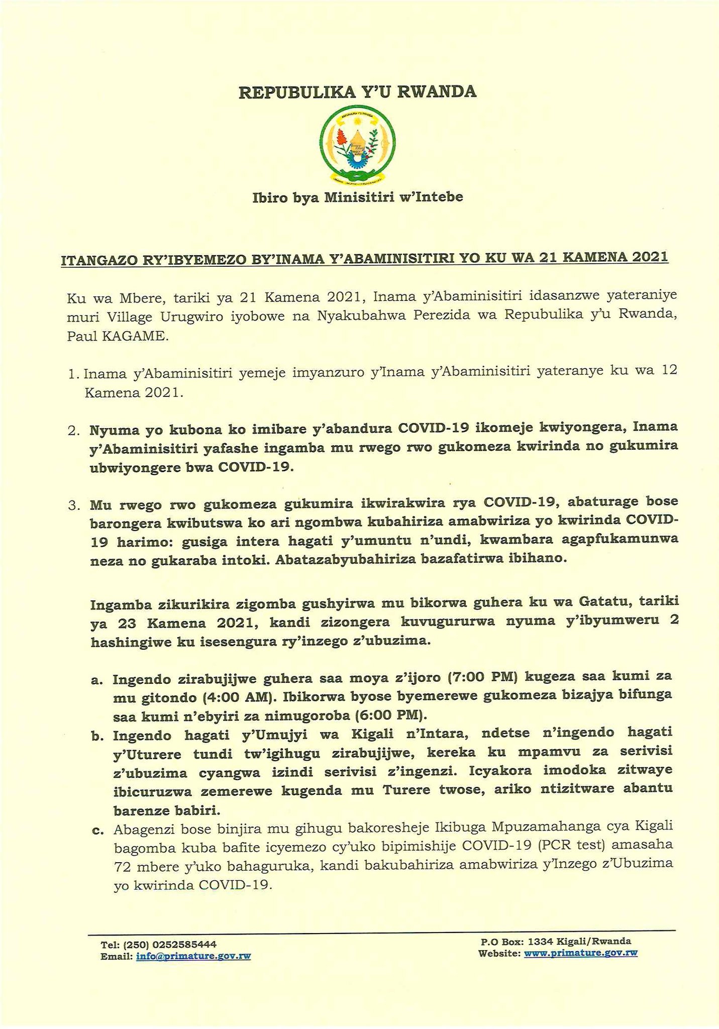 Akomeza ati “Ingendo hagati y’Umujyi wa Kigali n’Intara, ndetse n’ingendo hagati y’Uturere tundi tw’igihugu zirabujijwe, kereka ku mpamvu za serivisi z’ubuzima cyangwa izindi serivisi z’ingenzi. Icyakora imodoka zitwaye ibicuruzwa zemerewe kugenda mu Turere twose, ariko ntizitware abantu barenze babiri.”