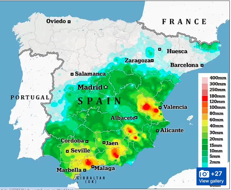 Iteganyagihe ryo muri iki gihugu rivuga ko aho iyo mvura izibanda ari ahitwa Tarragona, Castellón, Menorca, Mallorca, Andalucía, Huelva Na Condado.