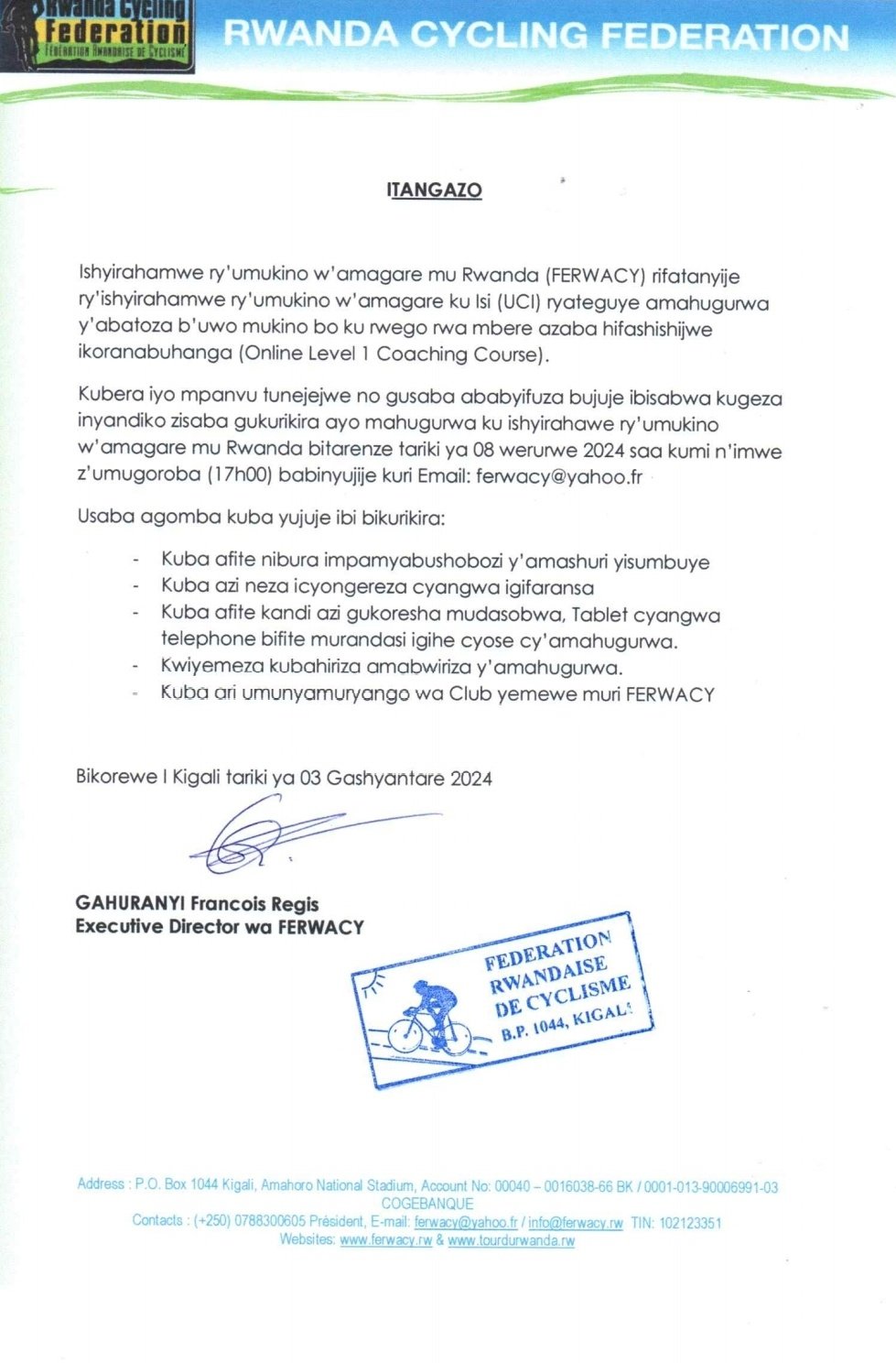 Bukubiye mu itangazo iyo Federasiyo yashyize kuri X, risaba abantu bose babyifuza ariko bujuje ibisabwa kuza guhugurirwa gutoza umukino w’amagare.