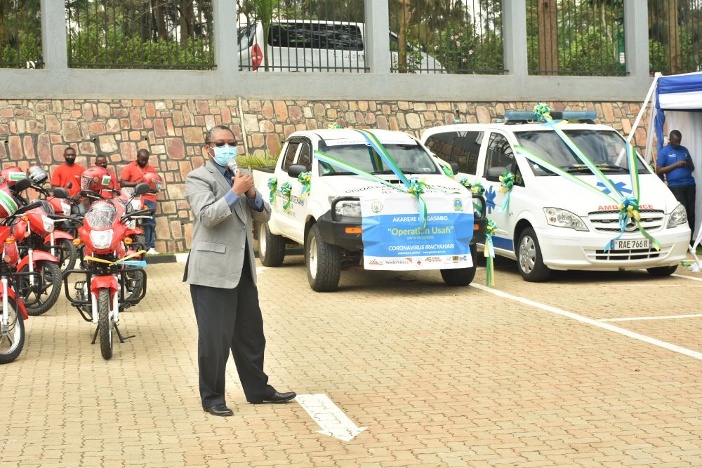 Umushyitsi mukuru mu muhango kwakira iriya mbangukiragutabara yari Minisitiri w’ubutegetsi bw’igihugu Prof Anastase Shyaka.