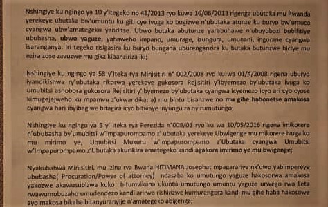 Uyu munyamategeko wo mu kigo cyubutaka ko ari hatari ra!!! Ati ndabandikira kdi nijye uzabasubiza ?!!! Mu kubasubiza ati sibyo, icyo bita ruswa rero!!!!!ubwo nabo bashaka kwambura ubwo butaka ba nyirabwo nabo yabandikiraga ibindi akabalancinga uwamuhaye agatubutse niwe yahaye igisubizo cyiza, gusa birababaje, ubwo se niba icyo kigo cya ESCOM, urukiko rwaremeje ko kitabaho, bazajya mu ruhe rukiko, baburana nande se? Uwo uhagarariye ikitabaho, ni akumiro pe sinzi igihe akarengane kazashirira kuko abagakemuye ibibazo barimitse inda zabo.