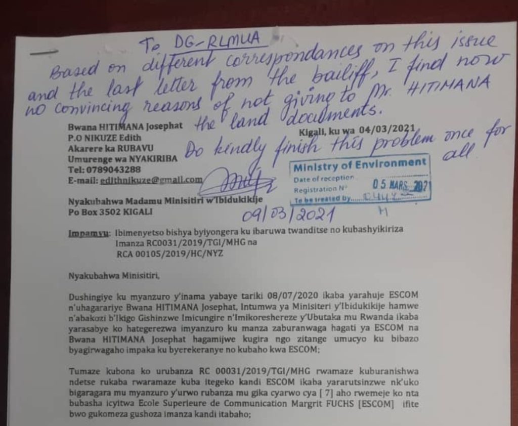 Urukiko rukimara gushimangira ko ubusabe bwa ESCOM nta shingiro bufite, ku wa 3 Mutarama 2021 Nikuze yandikiye Minisitiri w’Ibidukikije Dr. Mujawamariya Jeanne d’Arc, amusaba ko amakosa yakosorwa Hitimana agasubizwa umutungo we.