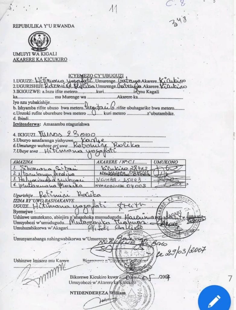 Ntabwo byasobanutse uburyo yabumenye n’imbago zabwo ngo ajye kubwandikisha, gusa byari byoroshye kuko Ntarwango Ferdinand babanaga muri ESCOM yari umwe mu basinyiye Padiri Hitimana nk’umugabo ubwo yabuguraga.