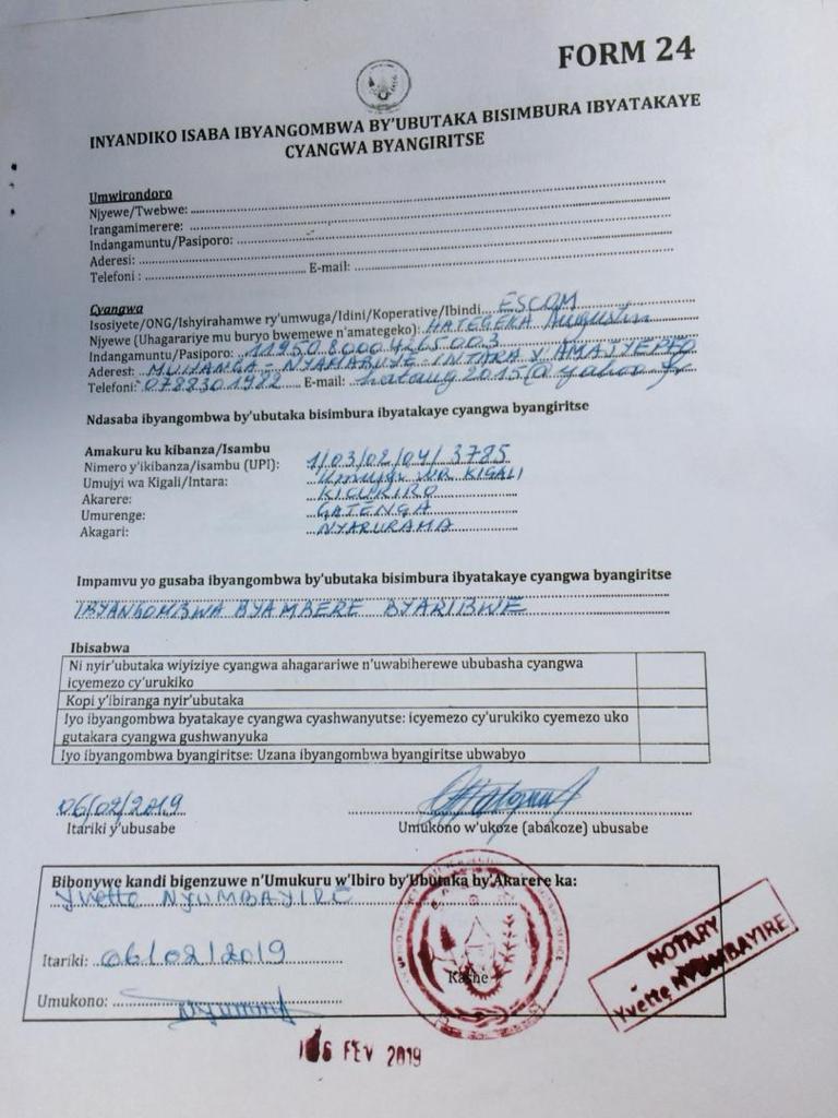 Yaje kurikoresha kwa noteri w’ubutaka, asaba guhabwa ibindi nk’uhagarariye icyo kigo.