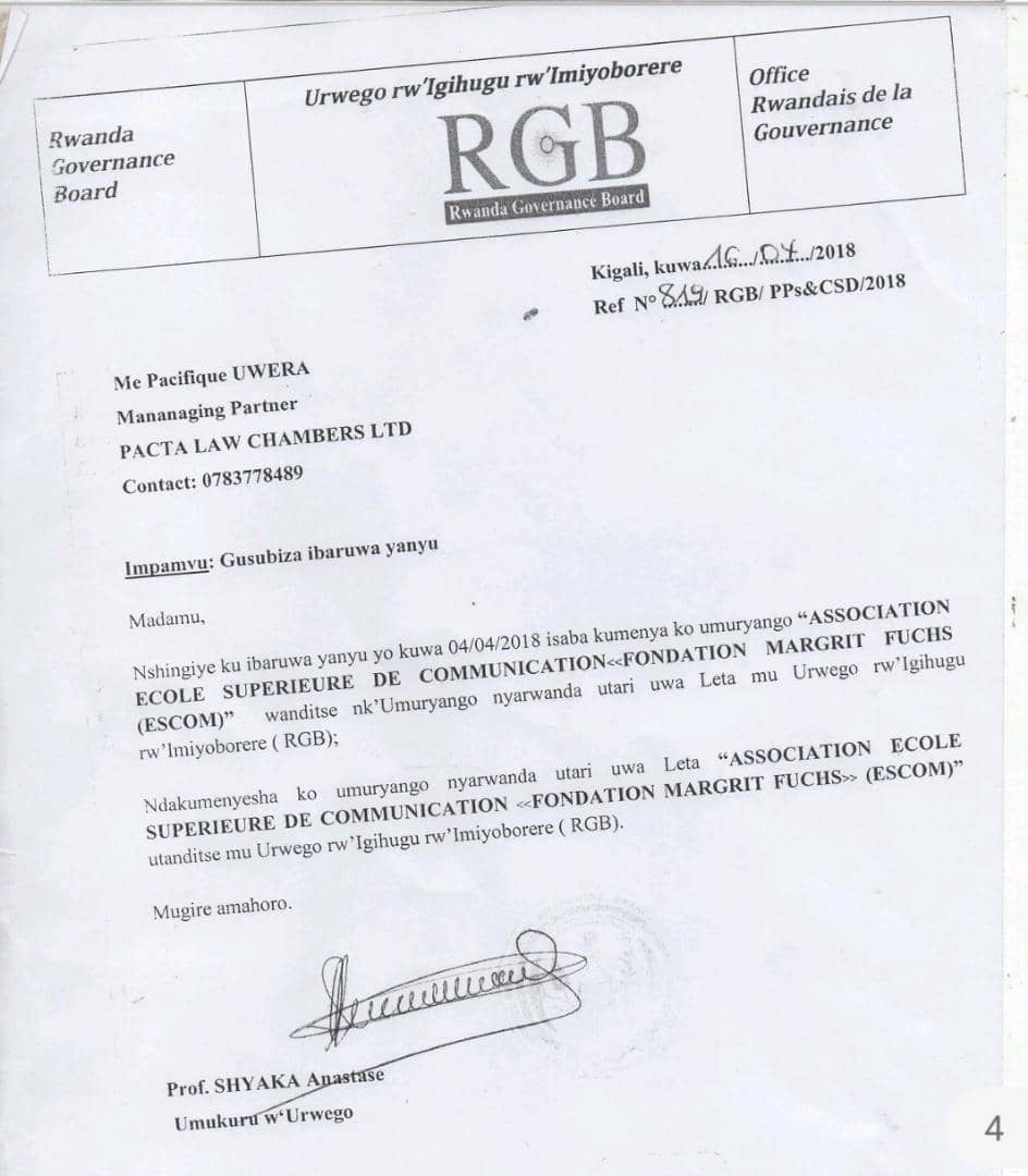 Muri iyo nyandiko bigaragara ko hasinyeho Padiri Hitimana wari uhagarariye ESCOM mu mategeko, Hategeka Augustin wari umwungirije na Nikuze Edith na Ntarwango Ferdinand nk’abanyamuryango.