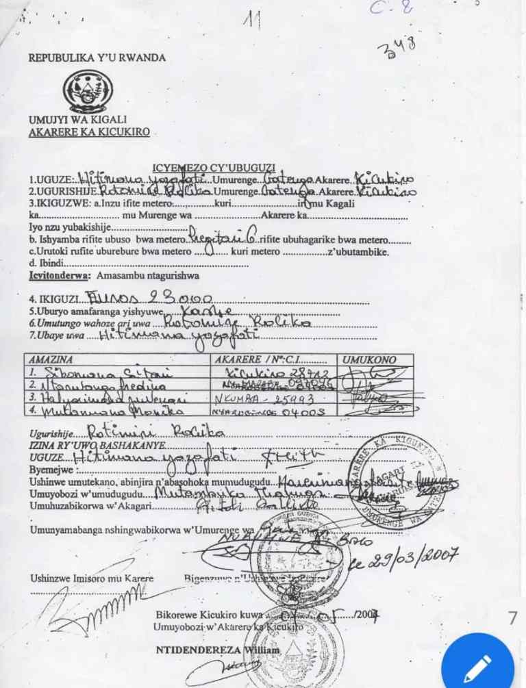 Ni inyandiko yo ku wa 4 Kanama 2011 yiswe ‘iy’igurishwa ry’ubutaka’ ariko ntivuga ubuguze uwo ariwe cyangwa amafaranga abuguze.
