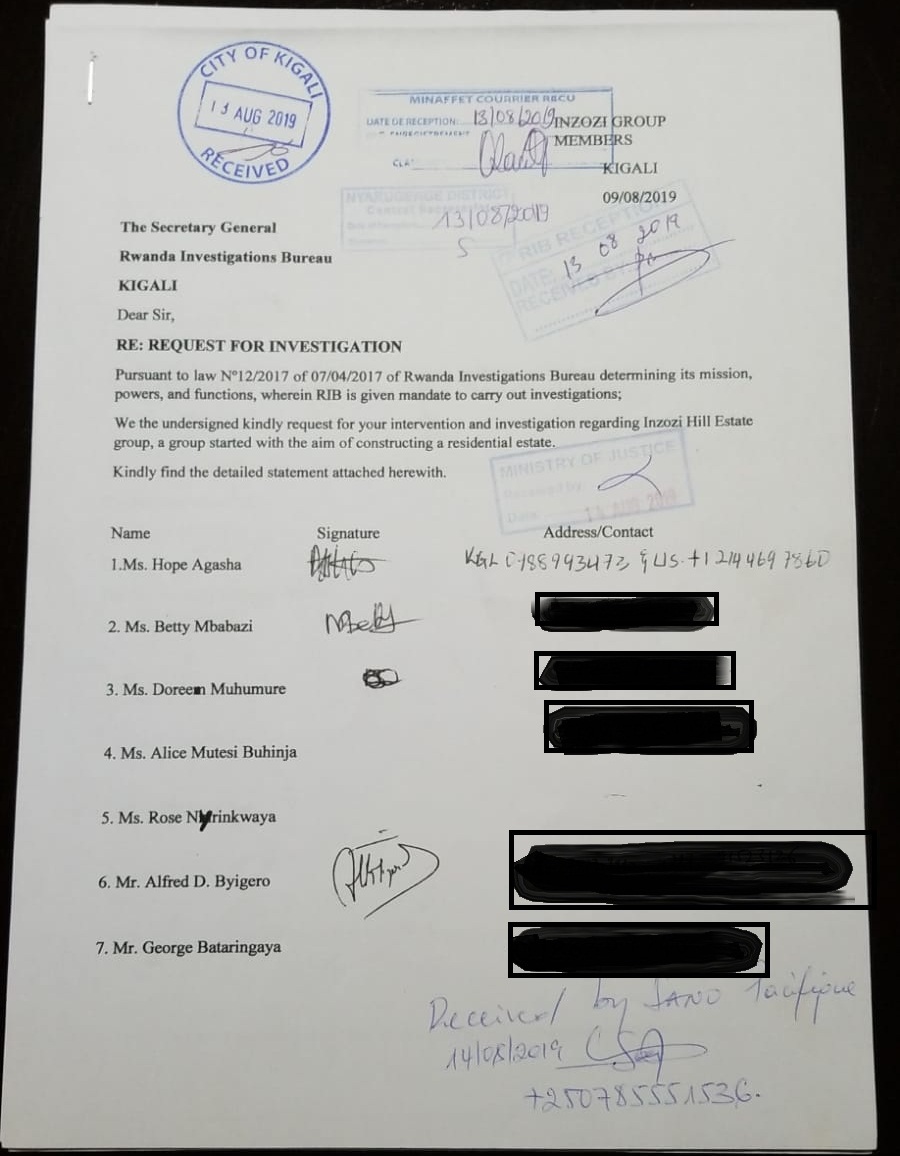 Mu ibaruwa banditse tariki 09, Kanama, 2019 ikakirwa n’uwitwa Sano Pacifique wo muri RIB ku itariki 14, Kanama, 2019 ivuga ko icyo gihe basabye RIB kwinjira mu kibazo cyabo, ikagenzura niba nta buriganya bwakozwe mu mushinga wo kububakira inzu bagombaga kujya bacumbikamo baje mu Rwanda, ariko RIB ibigendamo biguru ntege.