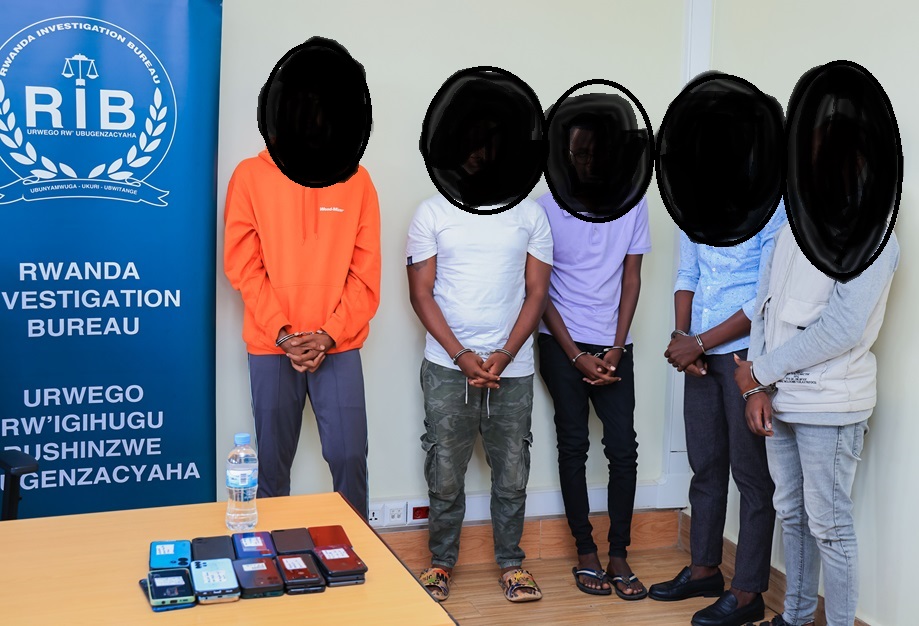 Urwego rw’Ubugenzacyaha, RIB, rweretse itangazamakuru abasore ruvuga ko rwabafatanye telefoni bibaga abaturage. Ni abasore batanu kandi ubona ko bakiri bato.