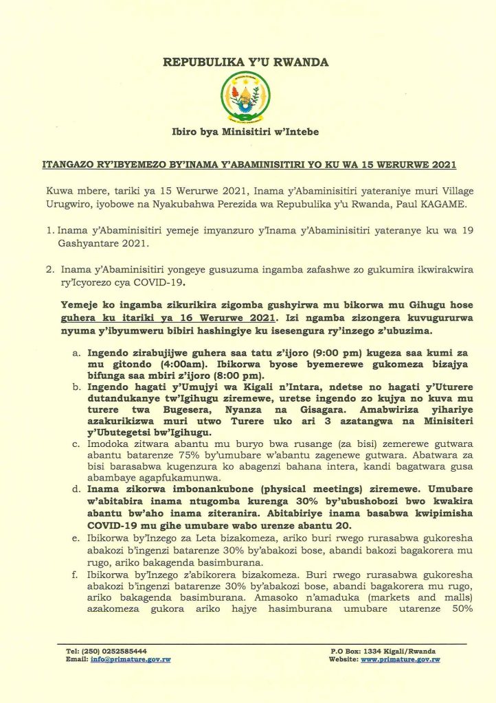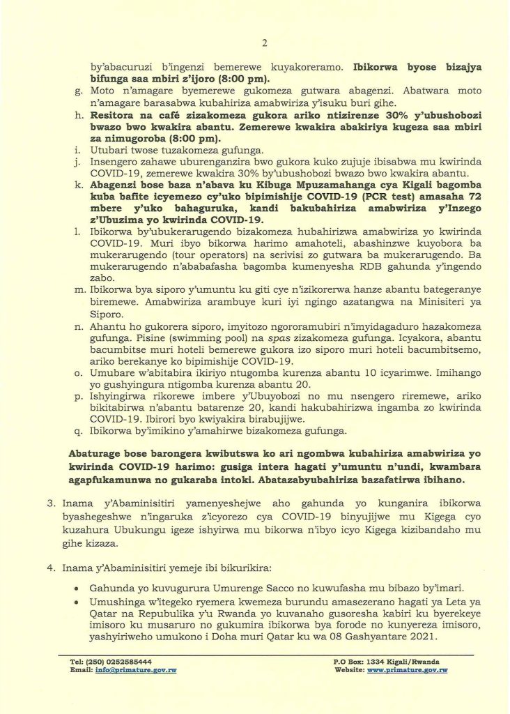 Ibikorwa byose byemerewe gukomeza bizajya bifunga saa mbili z’ijoro, mu gihe ubundi byafungaga saa kumi n’ebyiri nubwo kugera mu rugo mu rugo byari saa mbili z’ijoro.