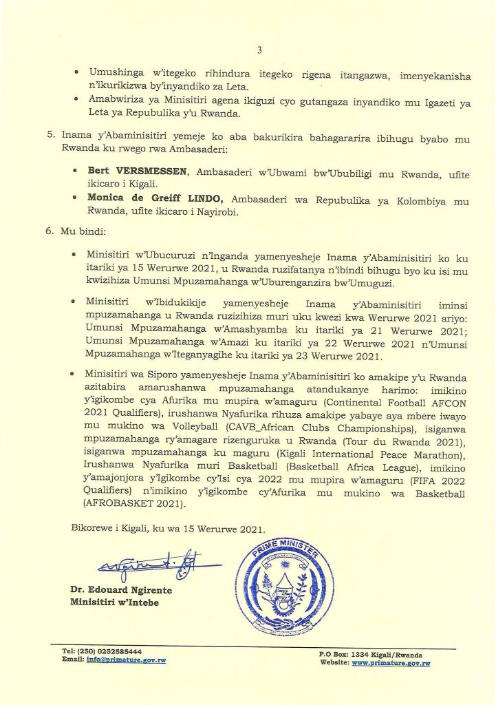 Ibindi byemezo byafashwe n’inama yateranye kuri uyu wa Mbere ni uko amasaha y’ingendo yongerewe, avanwa hagati ya saa kumi za mu gitondo na saa mbili z’ijoro, ashyirwa hagati ya saa kumi za mu gitongo na saa tatu z’ijoro.