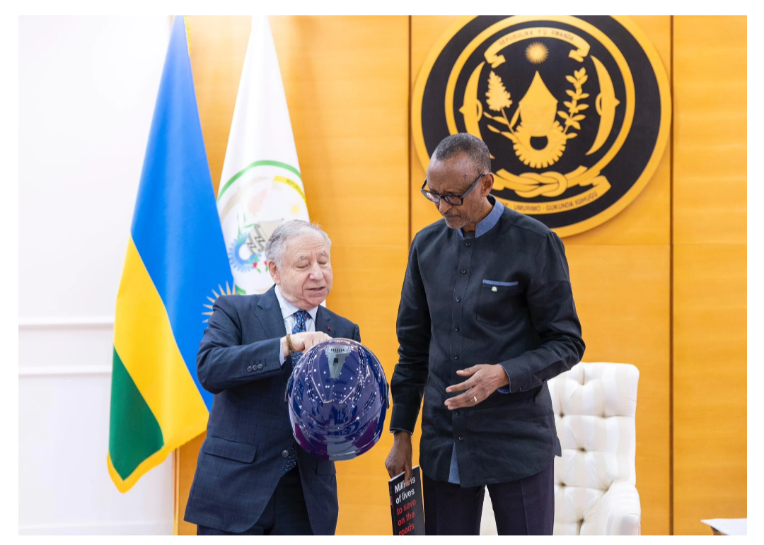 Jean Henri Todt yabonanye na Perezida Kagame nyuma yo kugirana ibiganiro na Minisitiri w’Ibikorwaremezo, Dr Jimmy Gasore, baboneraho gutangiza ubukangurambaga bwiswe ‘Tuwurinde’ busaba abamotari gukoresha kasike zujuje ubuziranenge, mu rwego rwo kurinda umutwe w’umuntu ugenda kuri moto.