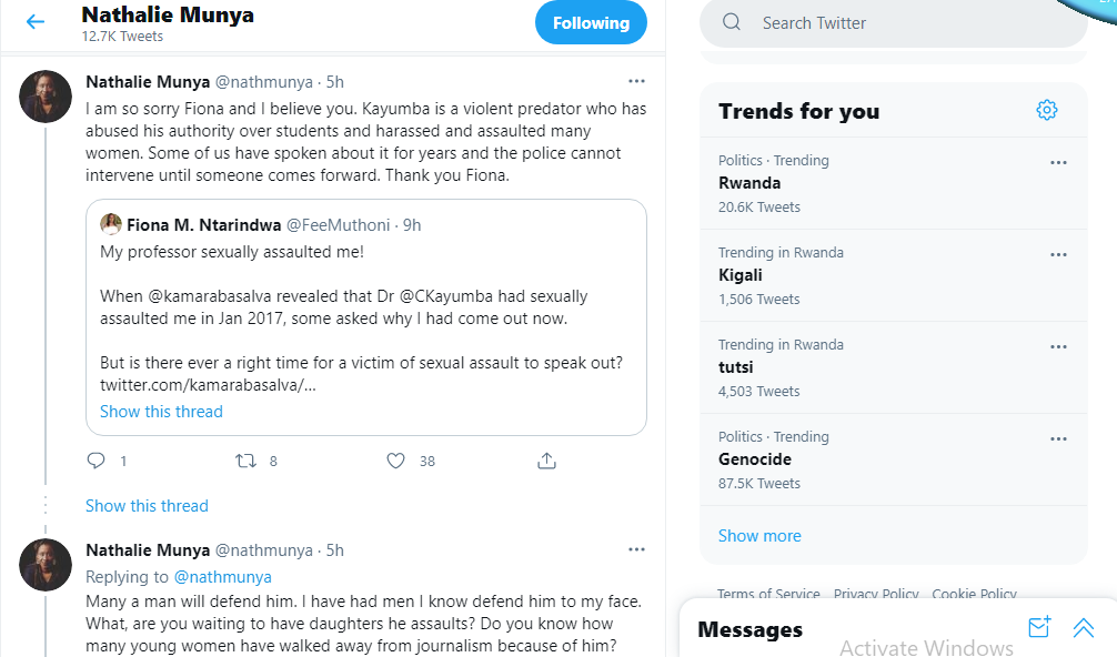 Kuri Twitter yanditse ati: “ Ibyakubayeho byambabaje nshuti Fiona kandi ndakumva rwose. Kayumba ni umuntu mubi wakoresheje ububasha yari afite ku banyeshuri be kugira ngo ahemukire abakobwa cyangwa [abagore] yigishaga. Bamwe muri twe barabivuze mu myaka myinshi yashize twabibwiye Polisi ariko ntacyo yakoze kugeza ubwo hagira umwe uhaguruka akabivuga. Ndagushimiye Fiona”