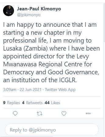Kuri Twitter Dr Jean Paul Kimonyo yanditse ko yishimiye kuba yimukiye i Lusaka muri Zambia kugira ngo ayoborere yo kiriya kigo.