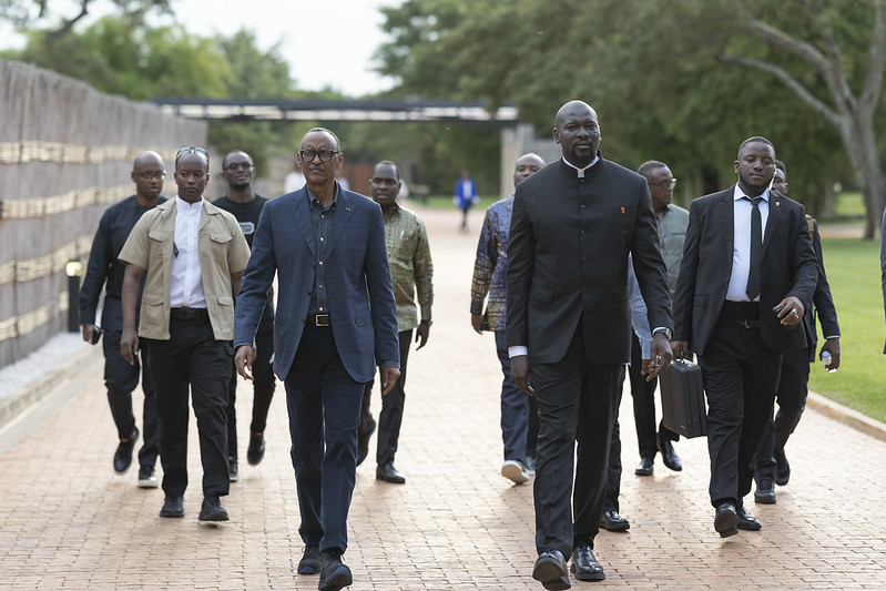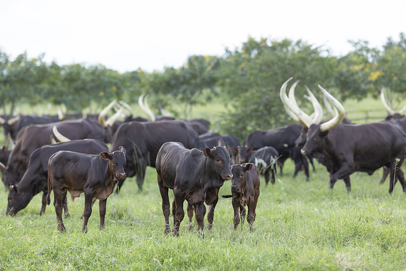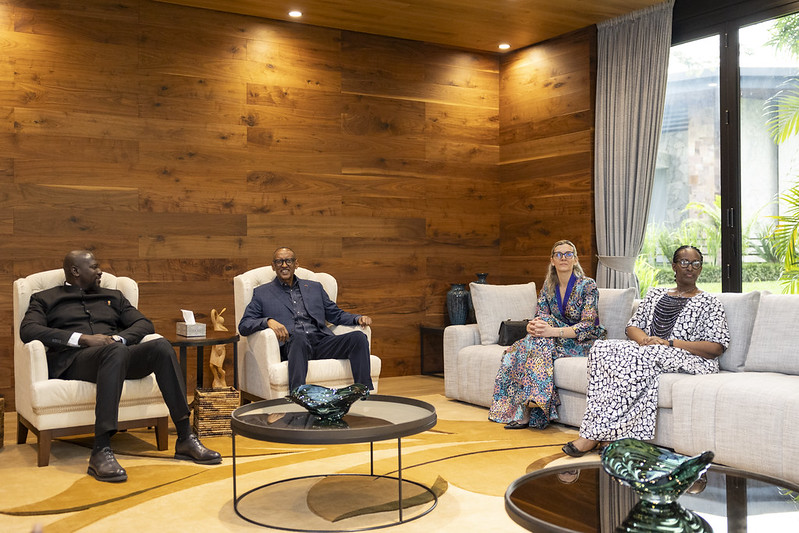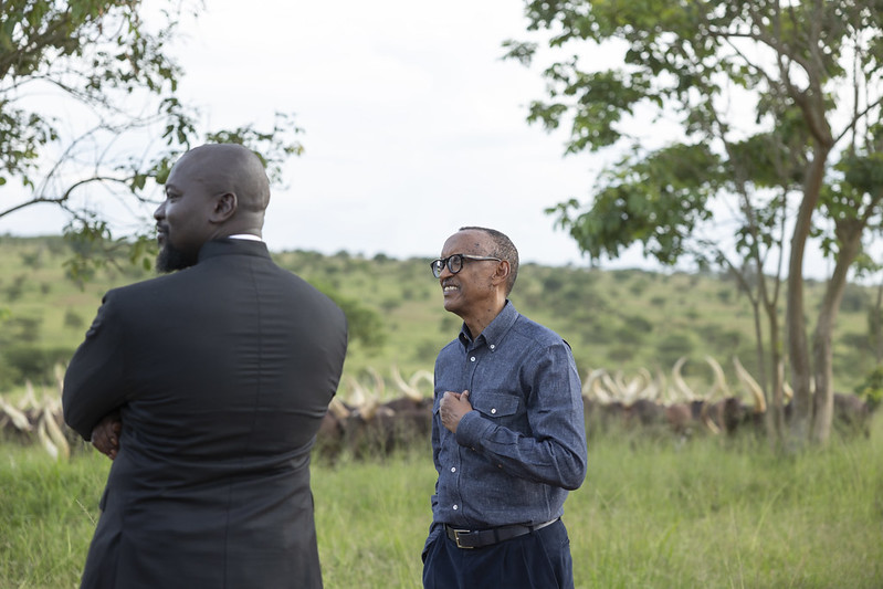Perezida Paul Kagame na Madamu Jeannette Kagame baraye bakiririye Général Mamadi Doumbouya uyobora Guinée-Conakry na Madamu we Lauriane Doumbouya mu rwuri rw’inyambo ze ruri i Kibugabuga Mu Murenge wa Ngeruka mu Karere ka Bugesera.