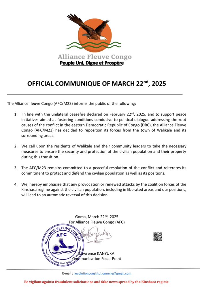 Nyuma y’igihe gito M23 ifashe Umujyi wa Walikale mu ntara ya Kivu y’Amajyaruguru, kuri uyu wa 22 Werurwe 2025, Ihuriro AFC/M23 ryatangaje ko ryanzuye kwimura ingabo zaryo zari ziri mu Mujyi wa Walikale no mu nkengero z’aho.