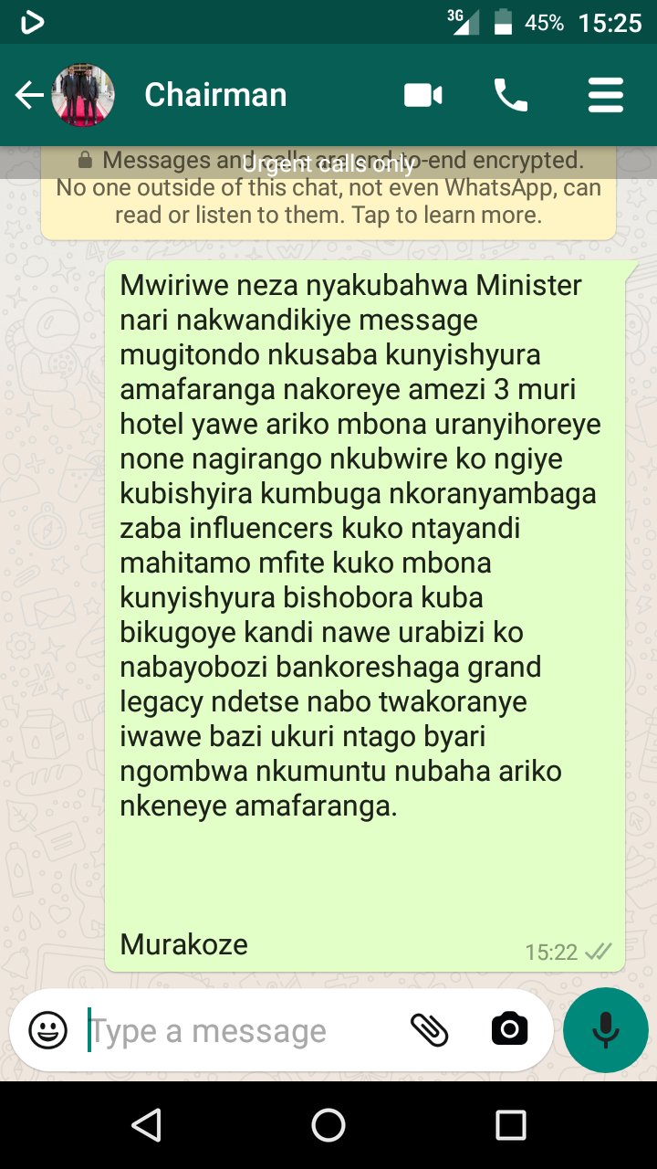 Muri Nyakanga 2020 ngo Bamporiki yamutumyeho umwe mu bakozi be muri hotel ngo aze akomeze akazi, banakemure ikibazo.
