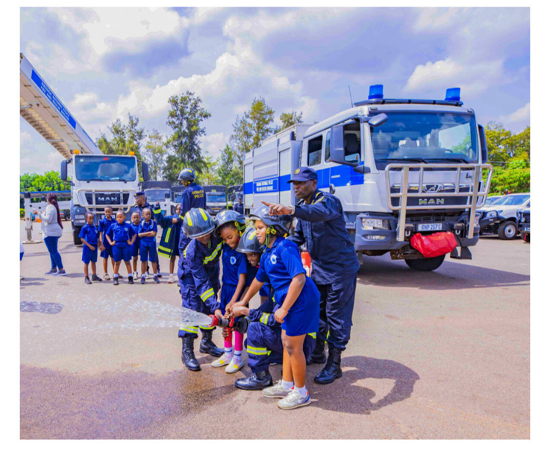 Abo banyeshuri basuye Polisi y’u Rwanda, Ishami rishinzwe kurwanya inkongi n’ubutabazi (Fire & Rescue Brigade), bahugurwa ku kwirinda no kurwanya inkongi.