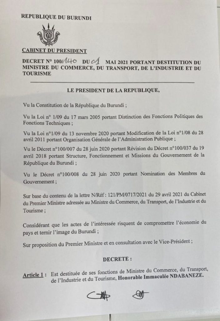 Ririya tangazo ryanditswe mu Gifaransa hari aho rigira riti: “ Minisitiri w’ubucuruzi, ubwikorezi, inganda n’ubukerarugendo Nyakubahwa Immaculée Ndabaneze avanywe ku mwanya we kubera imyitwarire idahwitse kandi ishobora kugusha ubukungu bw’igihugu ukanashyira umugayo ku isura y’u Burundi.”