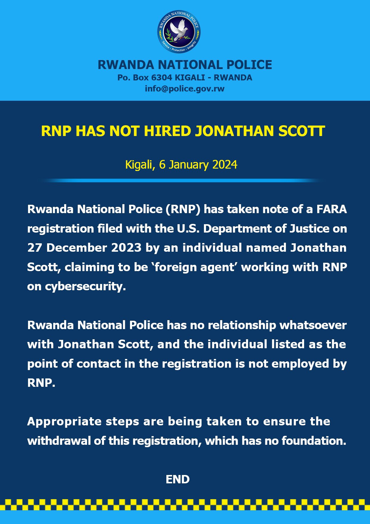 Mu itangazo rwasohoye, uru rwego rwagize ruti: “ Polisi y’u Rwanda yamenye ibikubiye mu byo Jonathan Scott yagejeje ku Biro by’Umunyamabanga w’Amerika bishinzwe butabera ashingiye ku itegeko rya FARA by’uko akorana na Polisi y’u Rwanda mu byerekeye umutekano mu by’ikoranabuhanga, Cyber-security.”