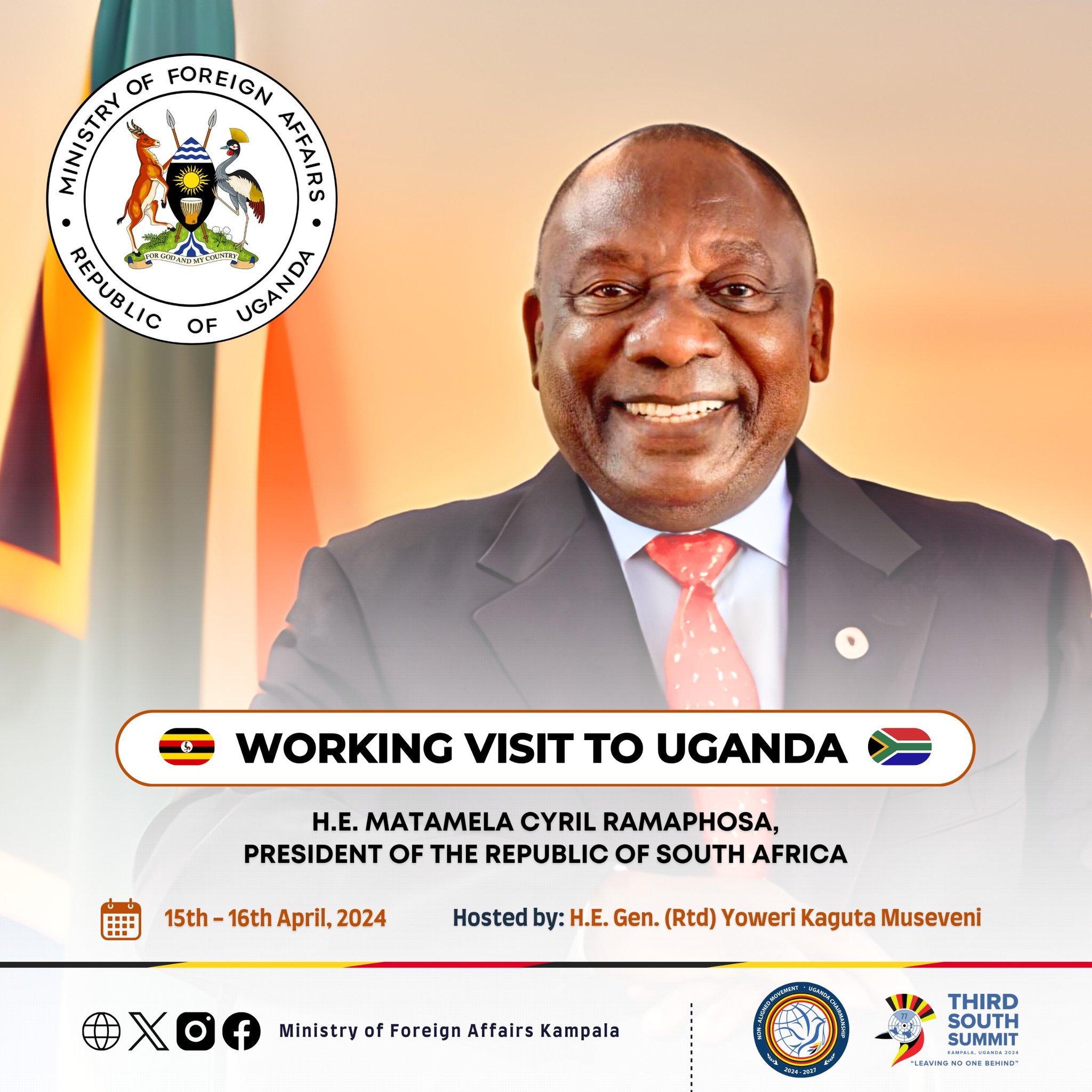 Mu ntangiriro z’Icyumweru kizatangira taliki 15, Mata, 2024 Perezida w’Afurika y’Epfo Cyril Ramaphosa azasura Uganda. Byatangajwe n’Ibiro bya Minisiteri y’ububanyi n’amahanga ya Uganda ku rukuta rwayo rwa X.