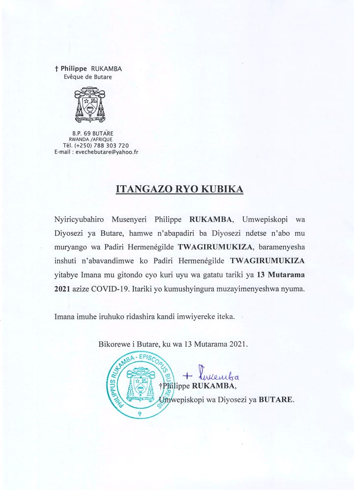 Padiri Twagirumukiza yapfuye mu gitondo cyo kuri uyu wa Gatatu tariki 13, Mutarama, itangazo rimubika rikaba ryasinyweho na Mgr Rukamba.