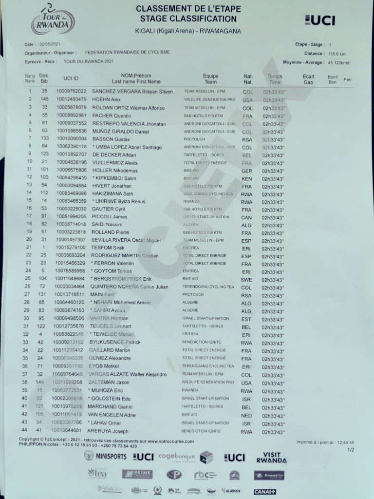 Mu gihe abakinnyi benshi basoje irushanwa begeranye cyane bizwi nka sprint, Sanchez ukinira Team Medellin -EPM yaje ku mwanya wa mbere akoresheje 2h 33’43”, akurikirwa n’Umunyamerika Hoehn Alex ukinira Wildlife Generation Pro Cycling na we wakoresheje 2h33’43”.