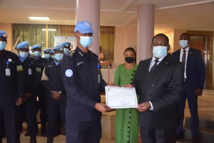 Minisitiri w’Intebe wa Repubulika ya Centrafrique, Firmin Ngrébada, yashyikirije impamyabushobozi z’ishimwe abapolisi 38 b’u Rwanda, bo mu itsinda ryihariye rishinzwe kumucungira umutekano. U Rwanda r...