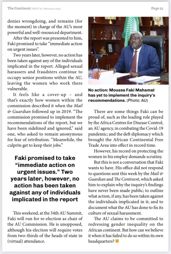 Hari raporo yo muri 2018 yigeze gutangazwa n’Ikinyamakuru Mail&Guardian yavugaga ko hari abakozi ba AU bagera kuri 44 bavugwaho guhohotera bagenzi babo badahuje igitsina.
