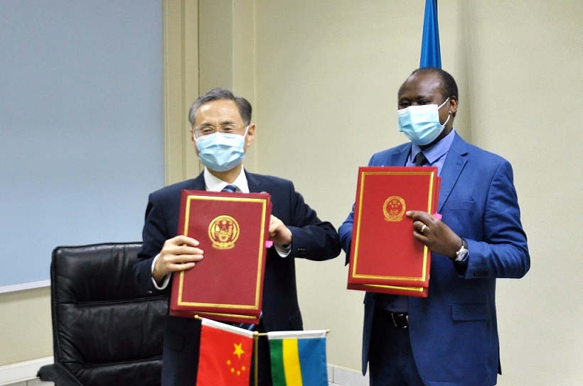 Ambasaderi w’u Bushinwa mu Rwanda Bwana Hongwei Rao ari kumwe na Minisitiri w’Imari n’igenamigambi w’u Rwanda Dr Uzziel Ndagijimana basinye amasezerano yemerera u Rwanda inkunga ya Miliyoni 60$ kandi akarusonera umwenda wa miliyoni 6$.