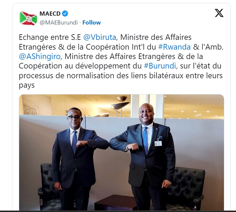 Kuri Twitter( ubu yiswe X), icyo gihe Minisiteri y’Ububanyi n’amahanga y’u Burundi yatangaje ko ibyo biganiro byibanze “ku miterere y’urugendo rwo kuzahura umubano mwiza hagato y’ibihugu byombi.”