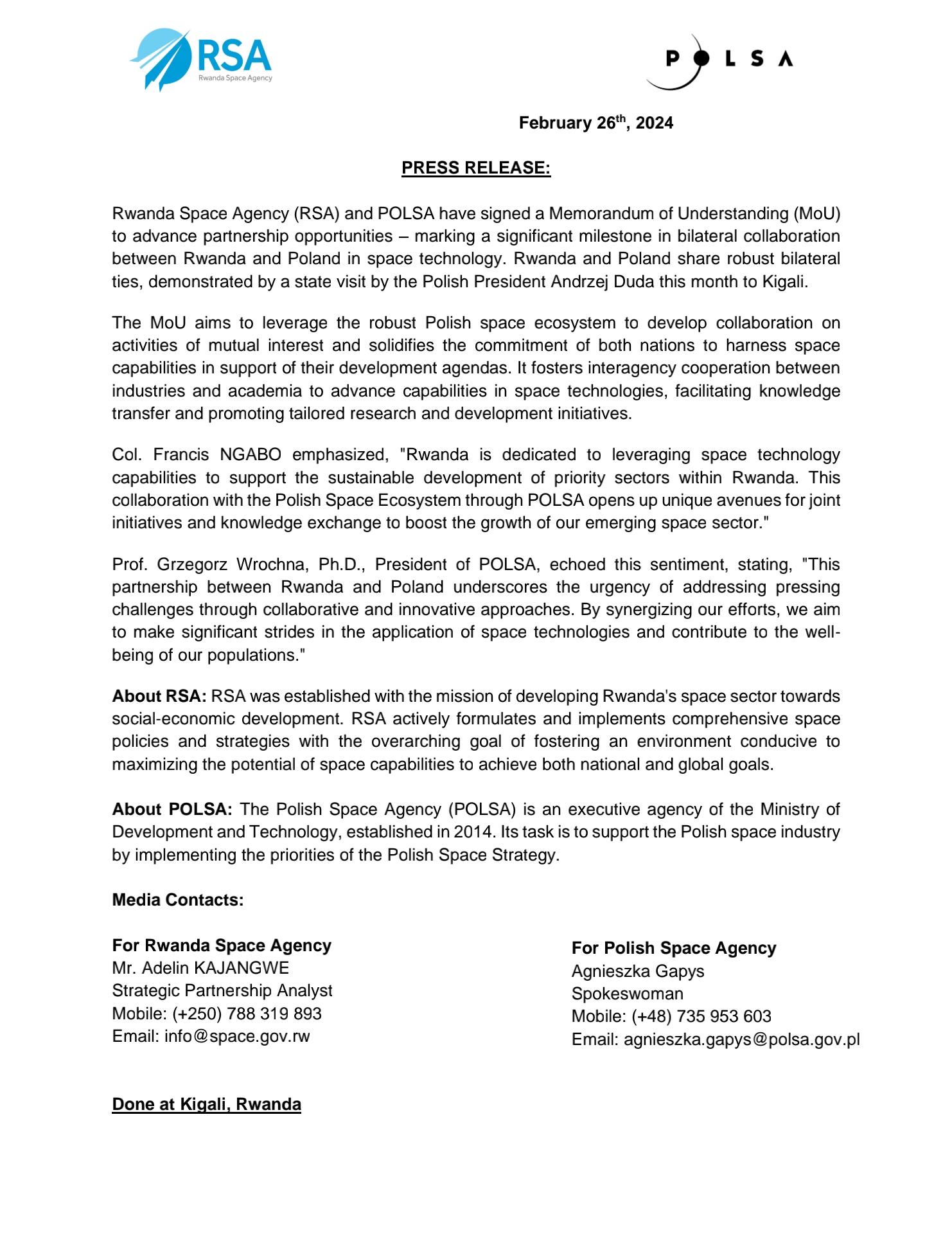 Guverinoma y’u Rwanda ibicishije mu kigo cyayo gishinzwe ibyogajuru, Rwanda Space Agency, yasinyanye n’iya Pologne amasezerano y’ubufatanye muri uru rwego.