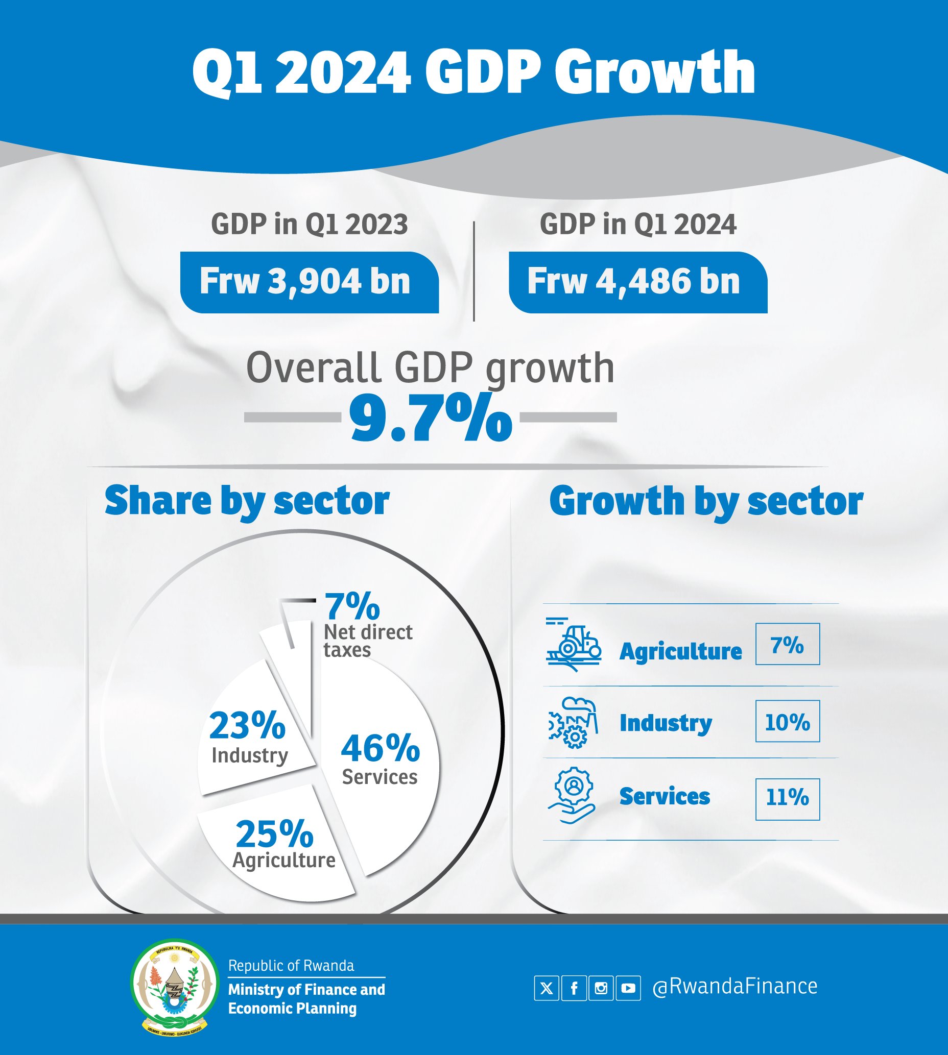 Mu gihembwe cya mbere cy’umwaka w’ingengo y’imari wa 2024, ubukungu bw’u Rwanda bwazamutse ku kigero cya 9.7% ahanini bitewe n’uko ubukungu muri rusange bwongeye kuzanzamuka ariko cyane cyane n’umusaruro w’ubuhinzi.