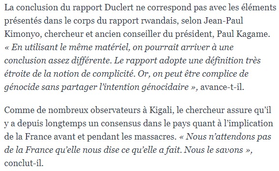 Kimonyo mu kiganiro yahaye Le Monde Afrique avuga ko ibikubiye muri raporo ya bariya bahanga biterekana mu buryo burambuye uruhare rw’u Bufaransa ahubwo ko biruca ku ruhande bigatanga ishusho nto yabyo.