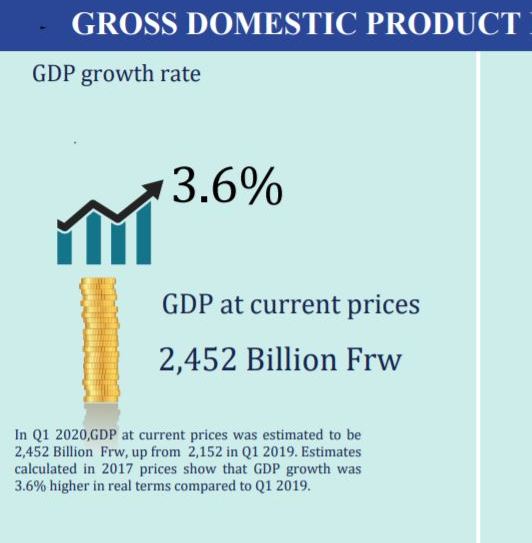 Ikigo cy’igihugu cy’ibarurishamibare kivuga ko umusaruro mbumbe w’igihugu wari miliyari 2,579 z’amafaranga y’u Rwanda, uvuye kuri Miliyari 2,410mu gihembwe cya mbere cya 2020.