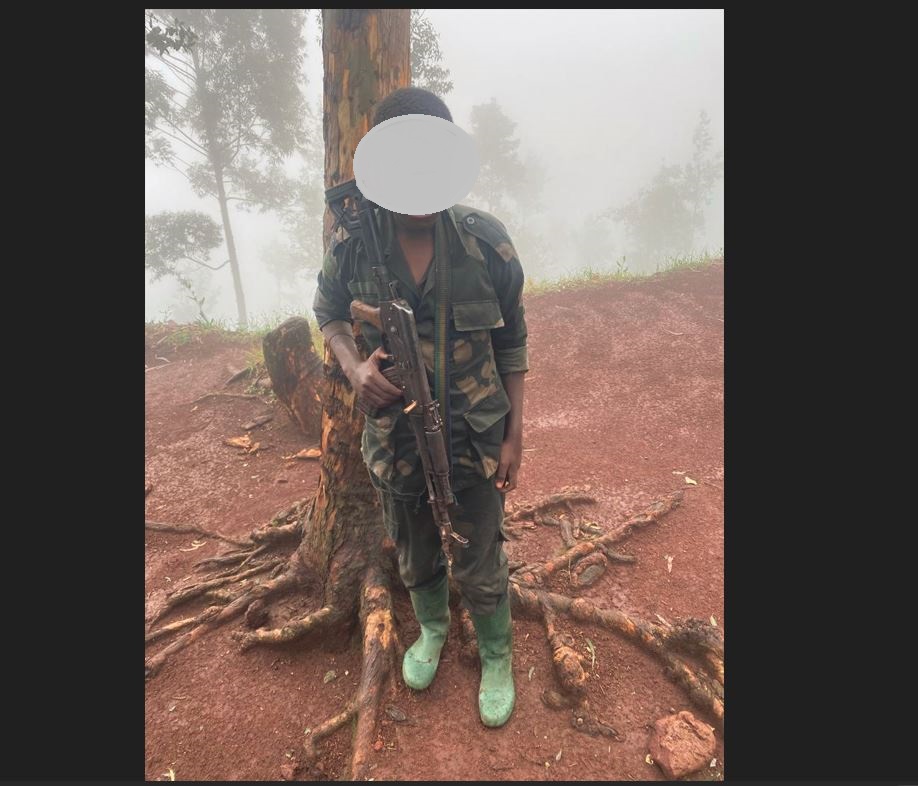 Uyu mwana bigaragara ko akiri muto yafatanywe imbunda yo mu bwoko bwa AK 47 ifite umukandara bayihekesha uri mu mabara y’ibendera ry’u Rwanda( ubururu, umuhondo n’icyatsi kibisi), yambaye impunzankano y’ingabo za DRC na bote z’icyatsi kibisi.