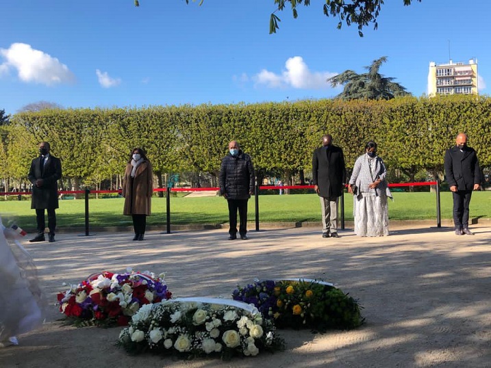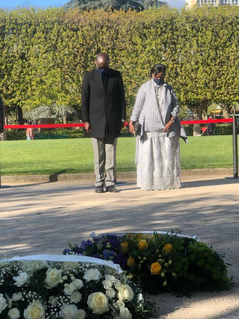 Madamu Anne Hidalgo uyobora Umurwa mukuru w’u Bufaransa, Paris, yifatanyije na Ambasaderi w’uRwanda muri kiriya gihugu, Bwana François Xavier Ngarambe bashyira indabo ku rwibutso rwa Jenoside yakorewe Abatutsi ruri i Paris.