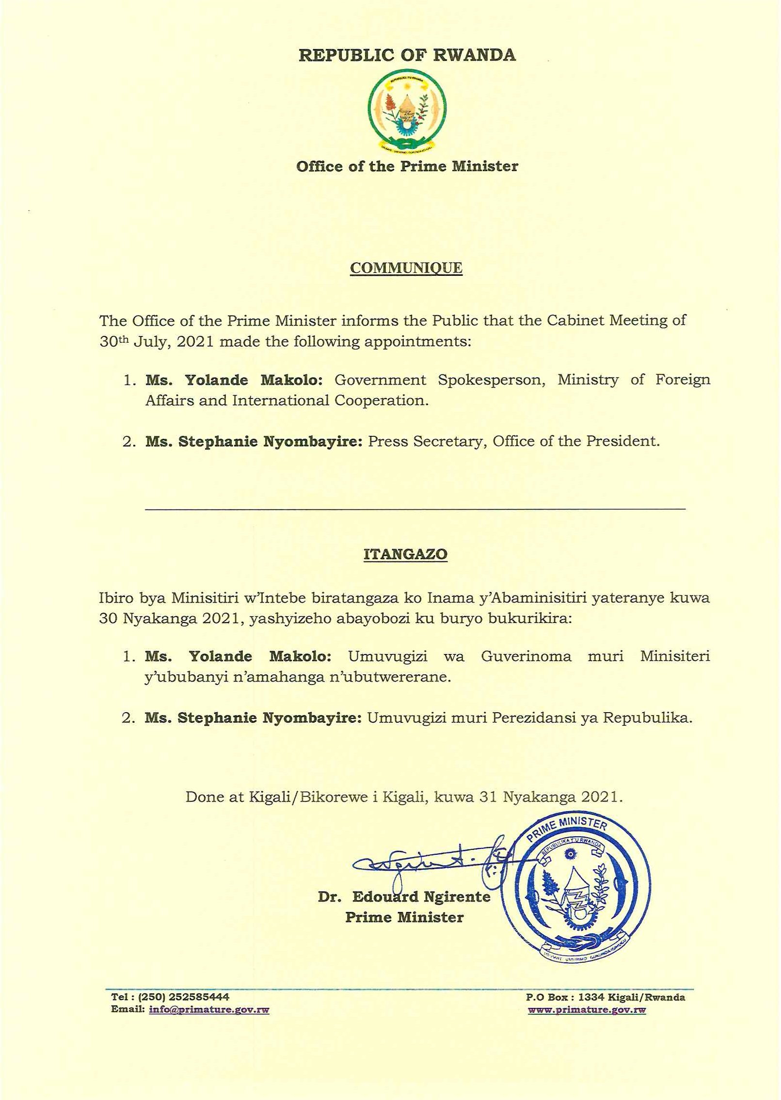 Itangazo ryasohowe n’Ibiro bya Minisitiri w’Intebe riravuga ko Madamu Yolande Makolo yagizwe Umuvugizi wa Guverinoma y’u Rwanda muri Minisiteri y’ububanyi n’amahanga y’u Rwanda naho Stephanie Nyombayire we akaba yagizwe Umuvugizi wa Perezidansi y’u Rwanda.
